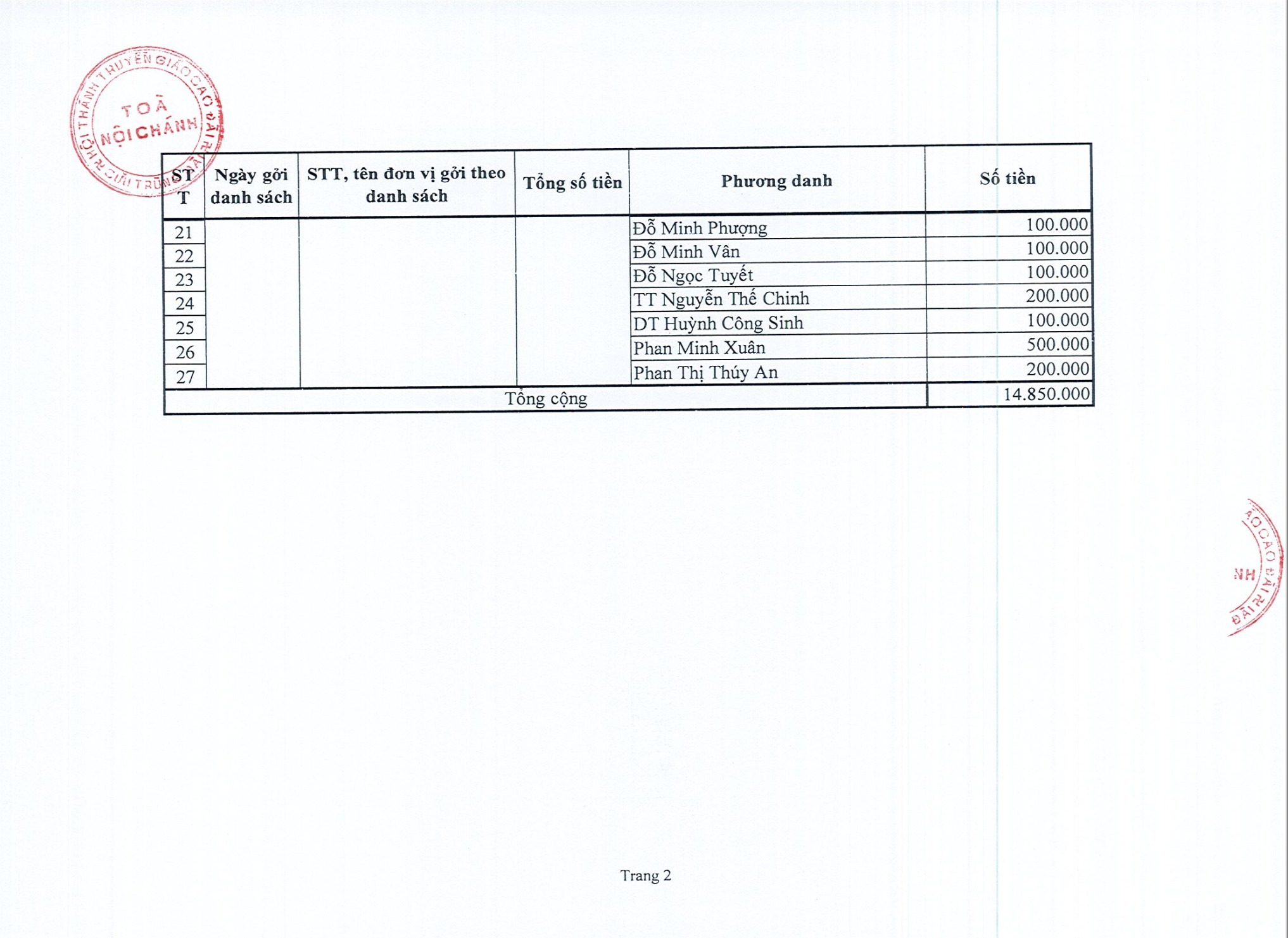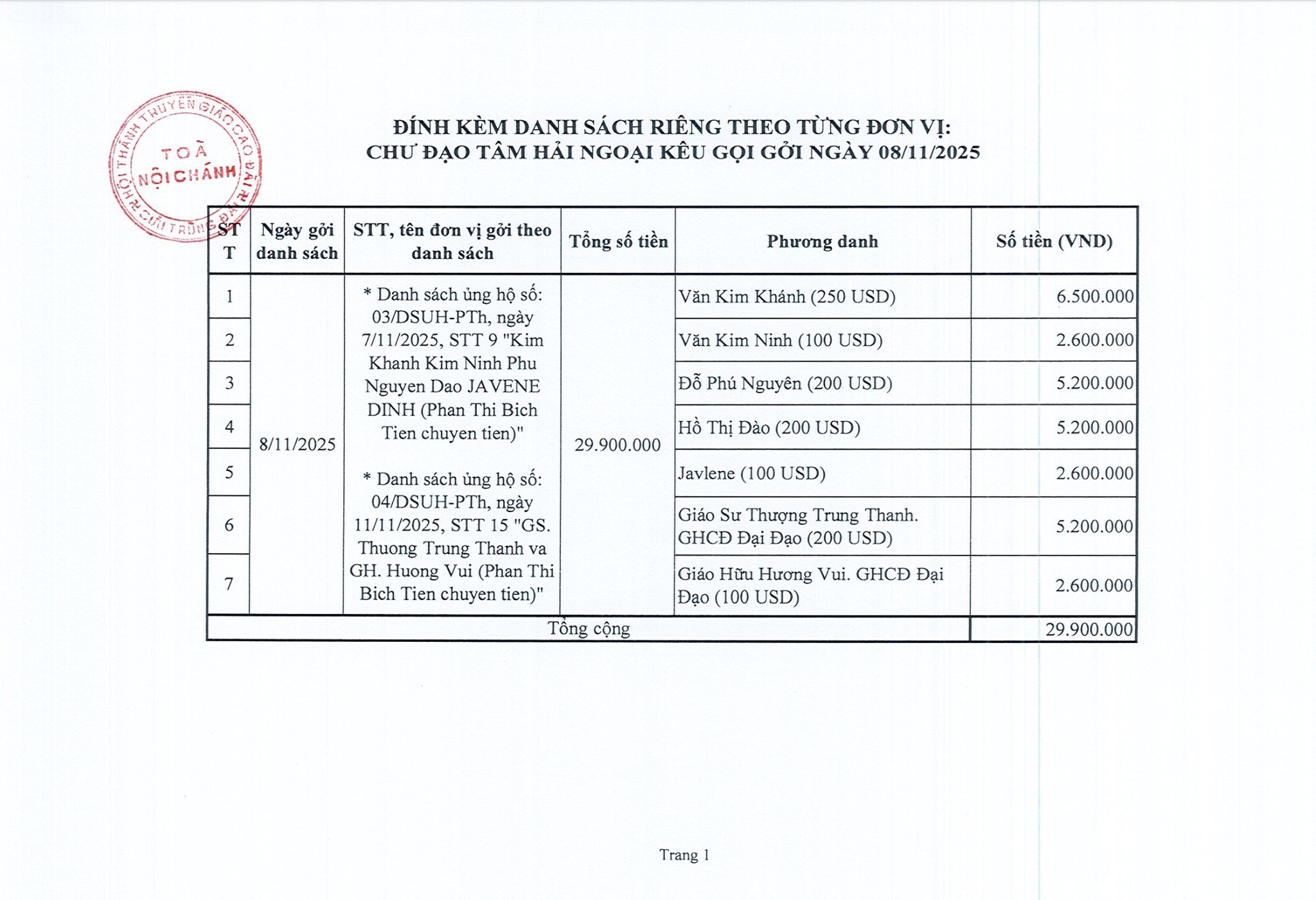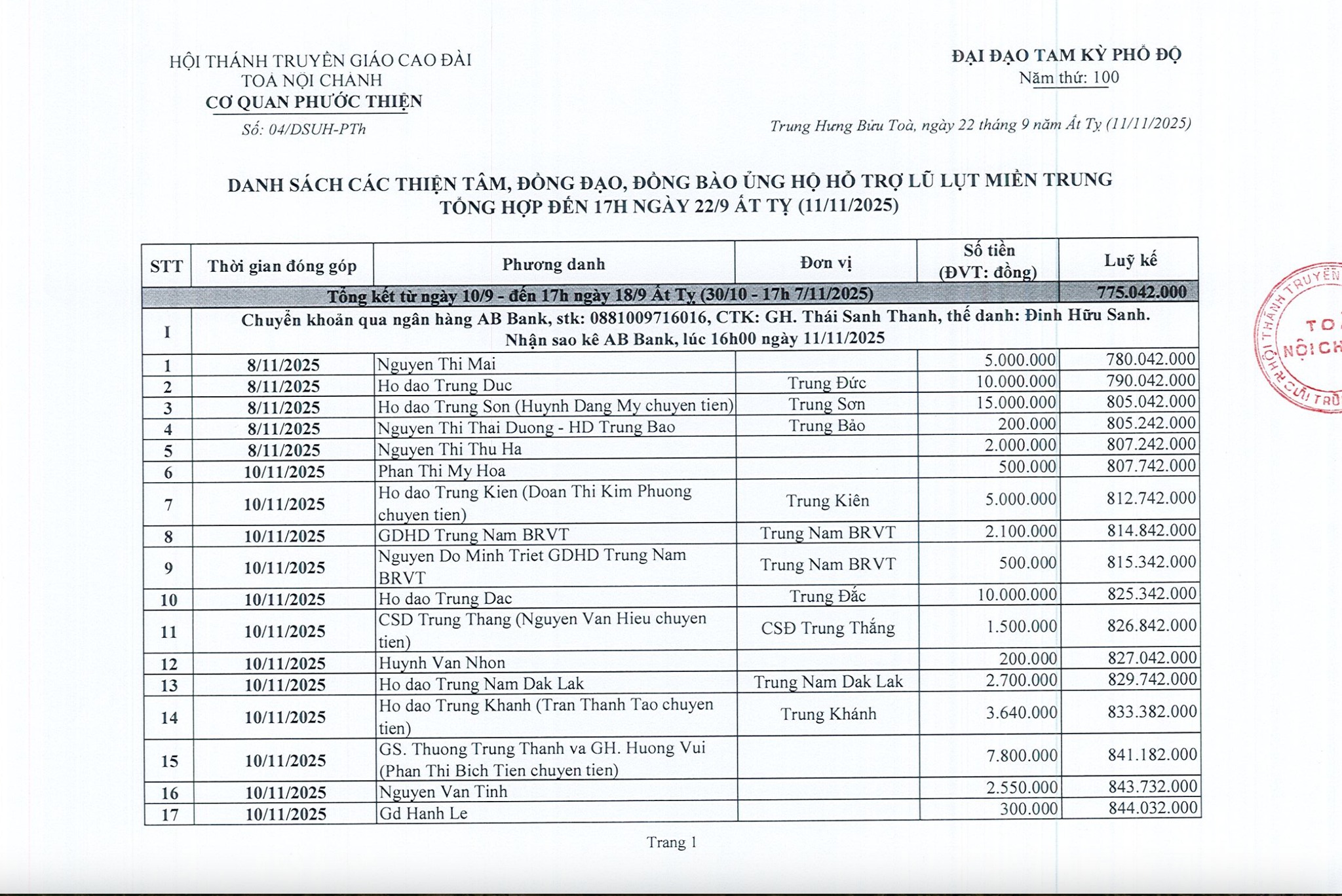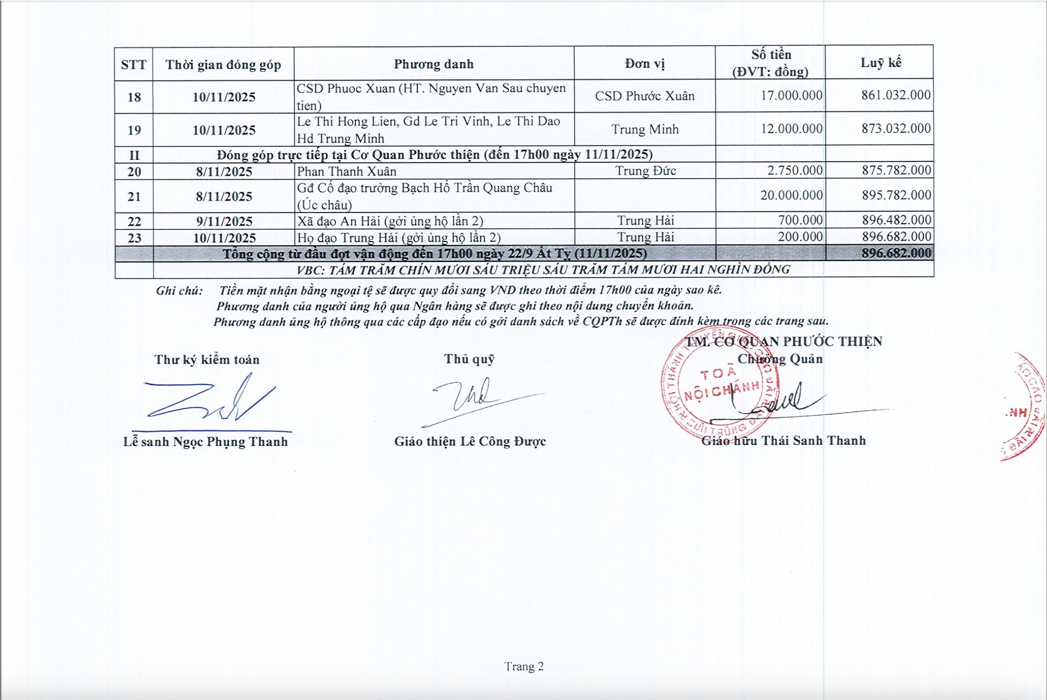 Tính đến hết ngày 22/09 Ất Tỵ (11/11/2025), Cơ quan Phước thiện Hội Thánh đã nhận được tổng cộng: 896.682.000 đồng (Tám trăm chín mươi sáu triệu, sáu trăm tám mươi hai ngàn đồng).