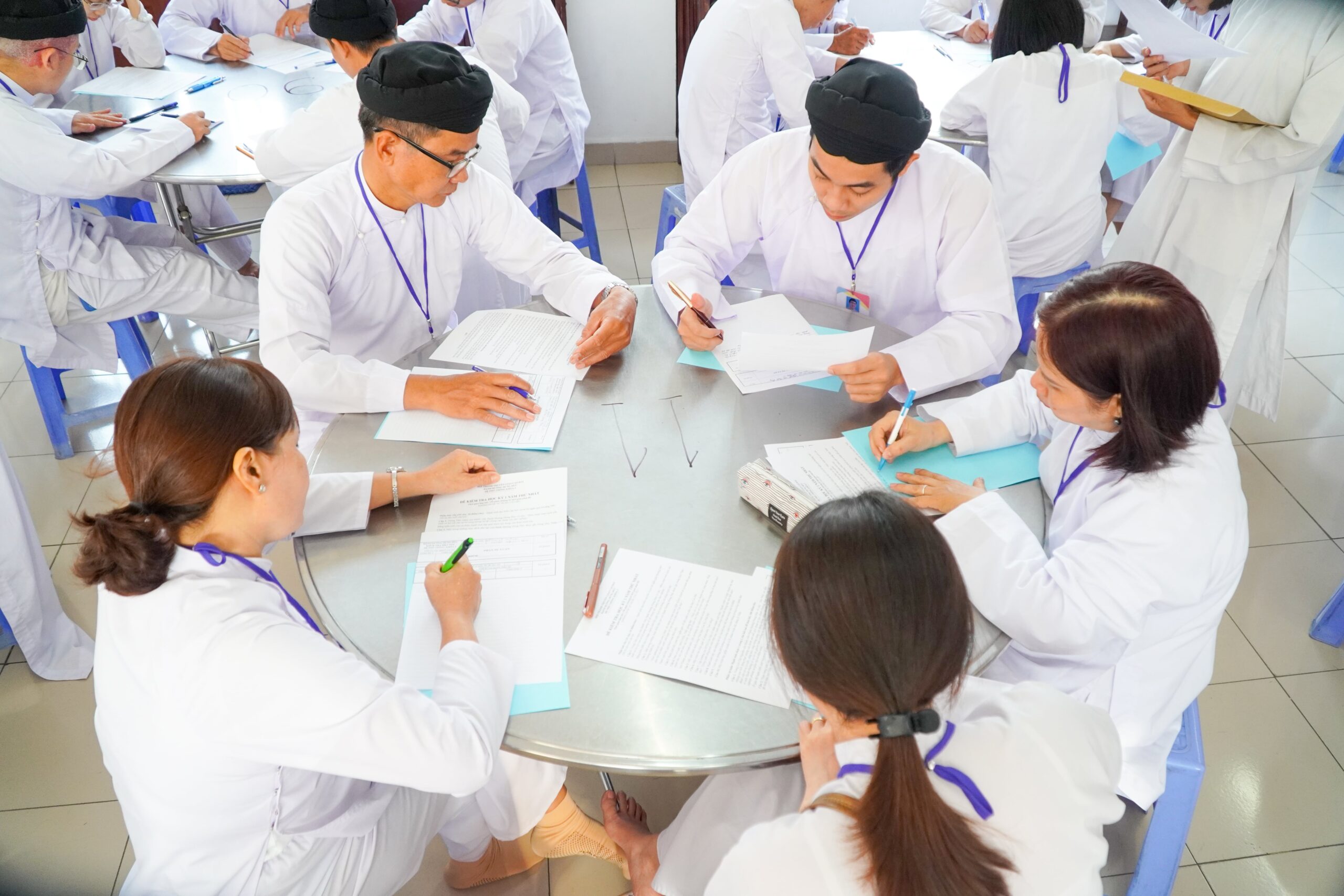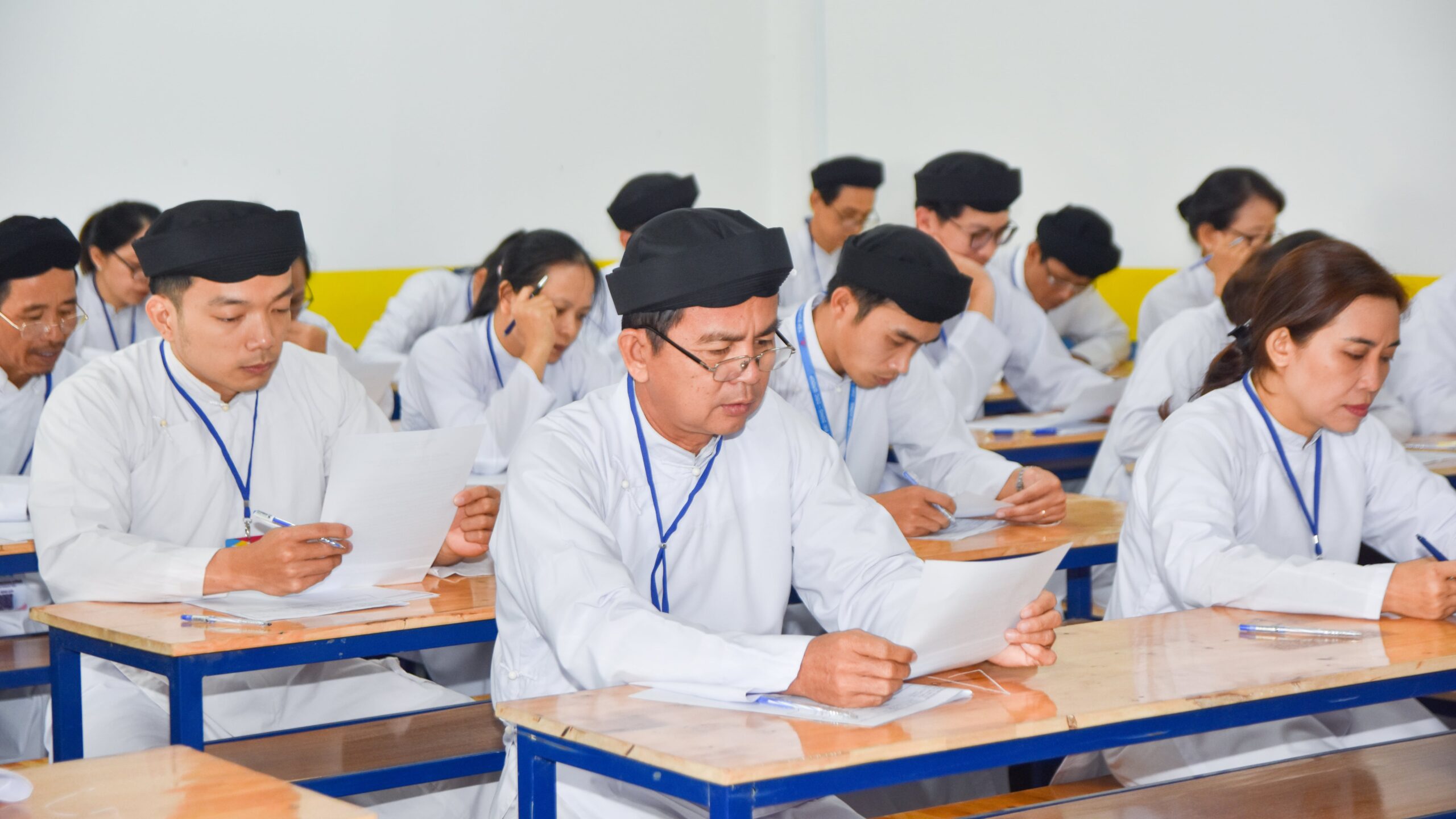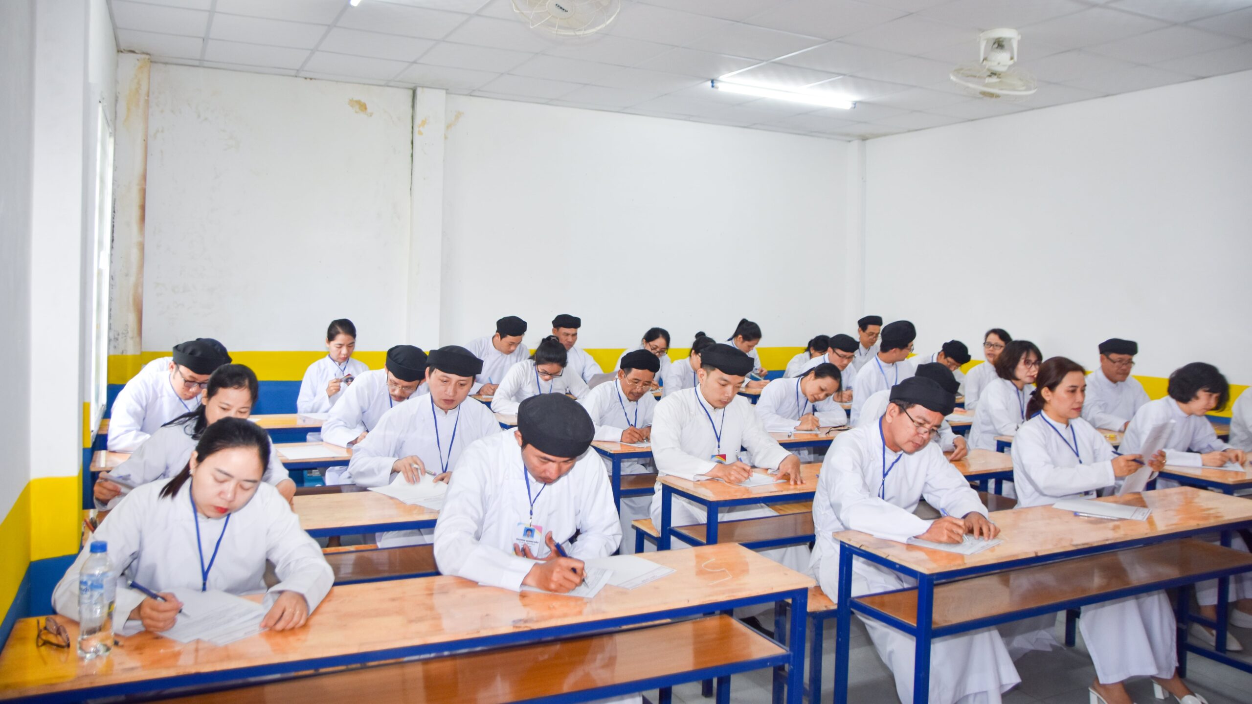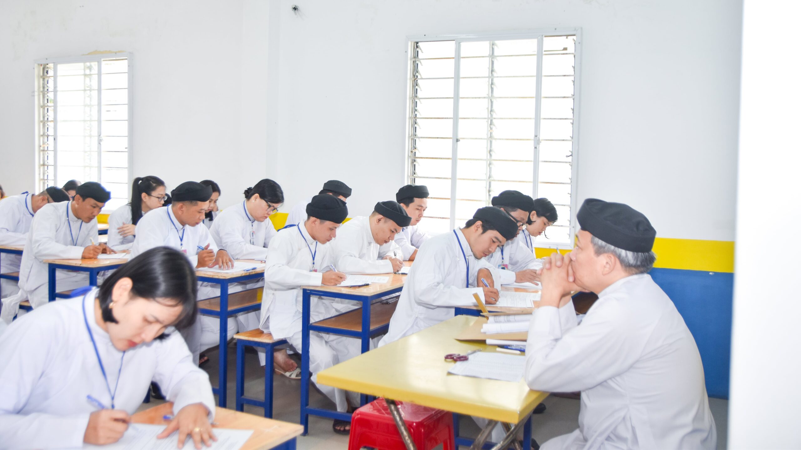 Buổi kiểm tra diễn ra từ 7h00 đến 10h00 với hình thức trả lời câu hỏi và tự luận. Tất cả hạnh sinh ở 2 địa điểm đều tuân thủ nghiêm túc quy chế thi, không có trường hợp nào vi phạm.