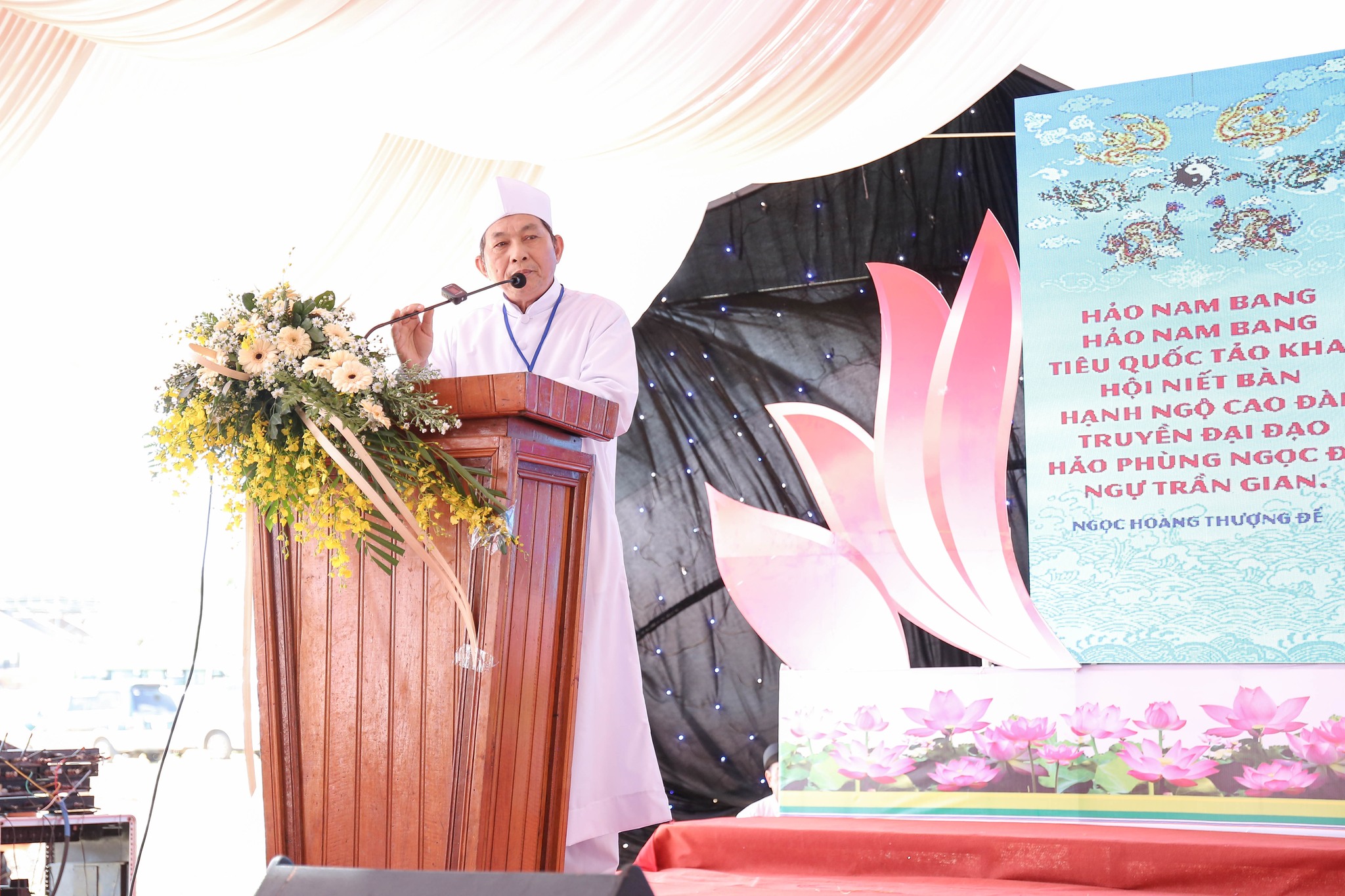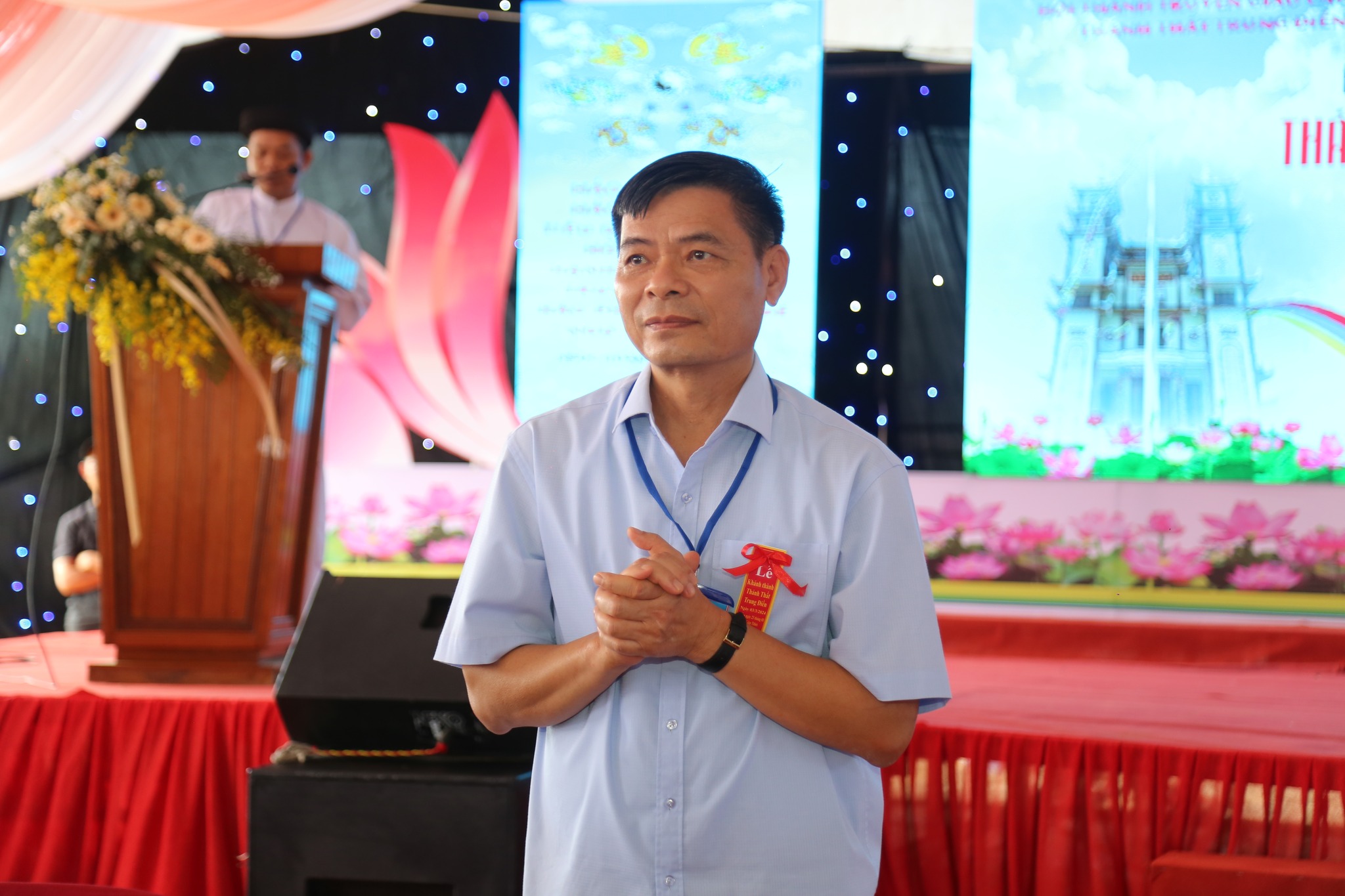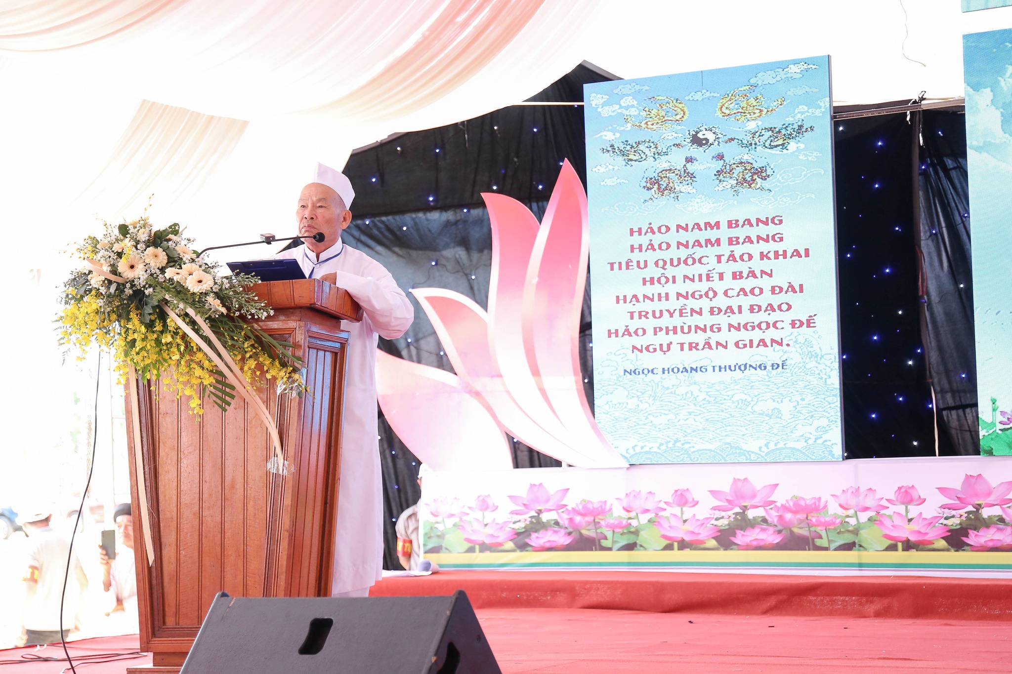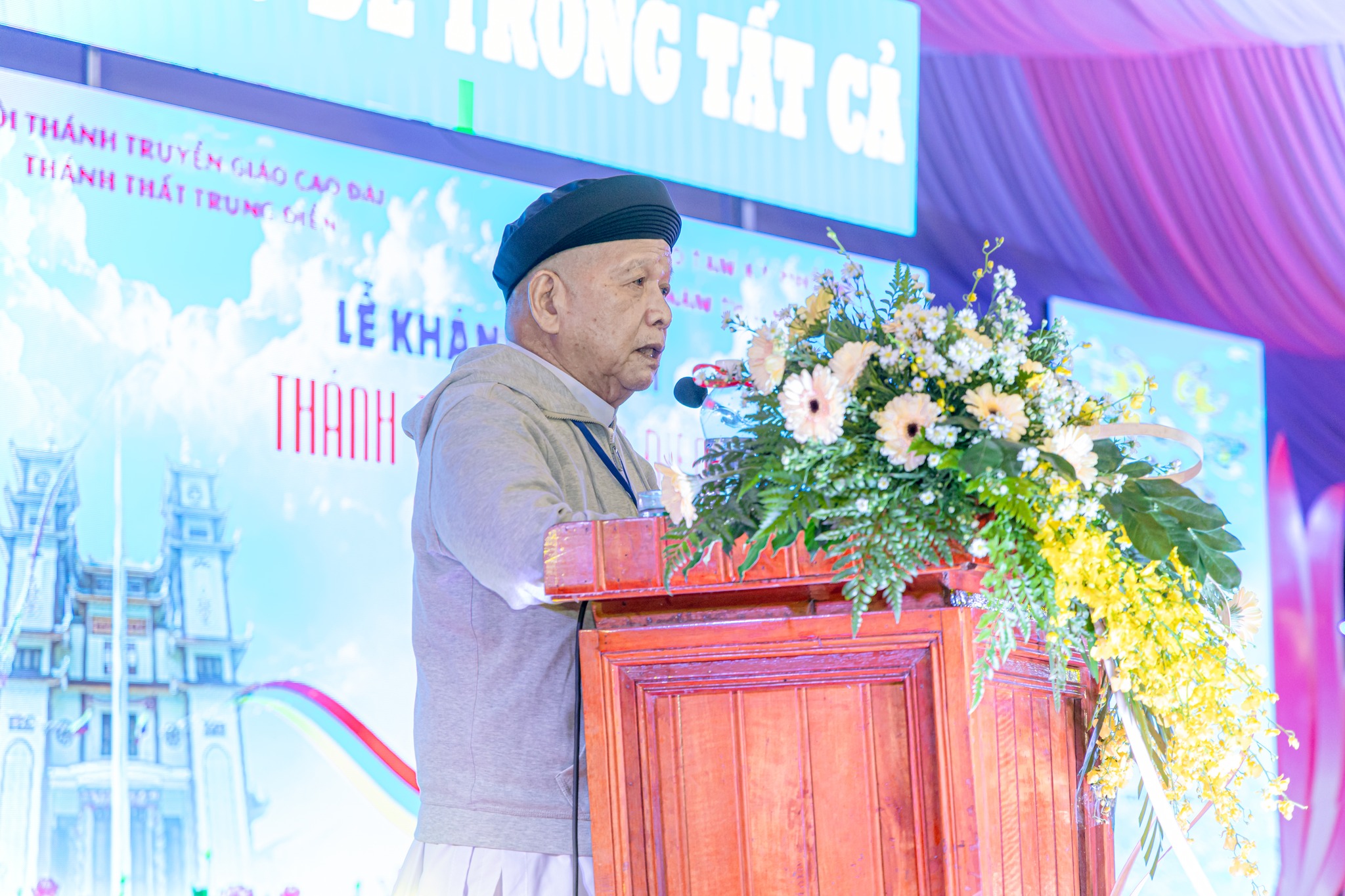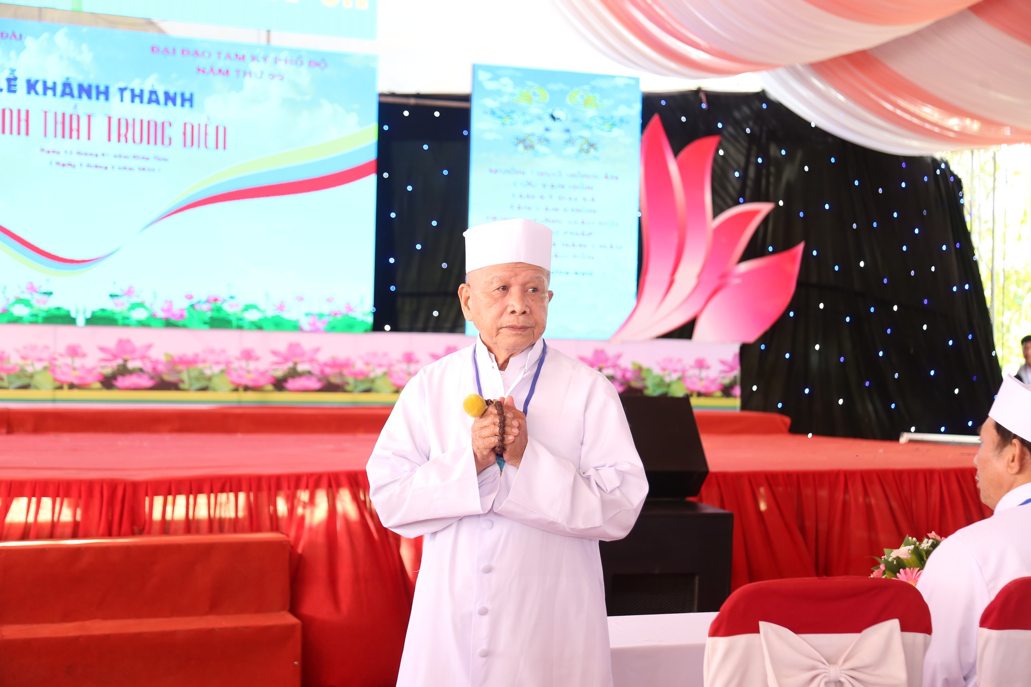Đại diện Hội Thánh, Đạo huynh Giáo hữu Thái Hải Thanh, Phó Chưởng quản Cơ quan Hành chánh gửi đến Đạo từ chúc mừng ngày đại lễ của AL Giáo sư Thượng Thứ Thanh, Chức sắc lãnh đạo HT do AL bận đạo sự không thể tham dự được. Đạo Huynh Đầu Họ Đạo HĐ Trung Điền, Lễ sanh Ngọc Nhường Thanh, đã có lời cảm tạ và chương trình tại lễ trường được khép lại. Sau đó là nghi thức cắt băng khánh thành trước ngôi Tam Đài vào lúc 10h30.